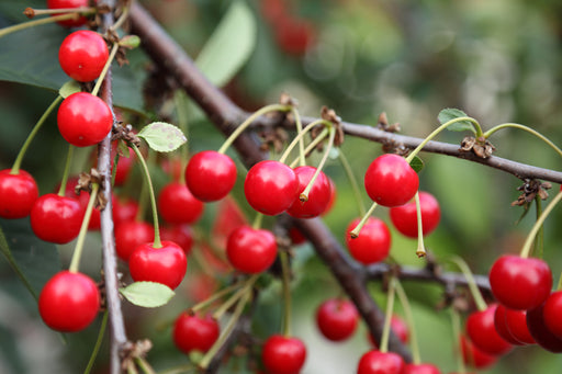 A tart bush cherry growing to less than 5' tall. Plant produces cherries along the length of the branch that ripen in late August to early Septembe...