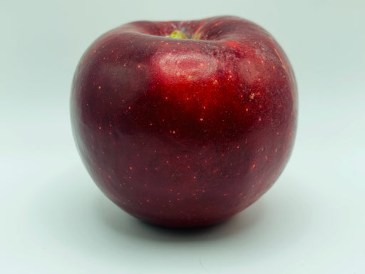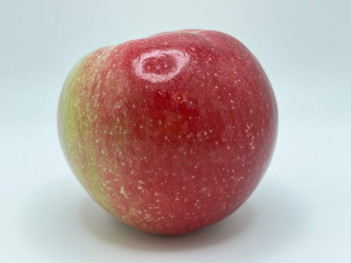 Apple is slightly elongated with a small bulge in the middle. Its skin has an orange hue to it that transitions to a bright red color when exposed ...