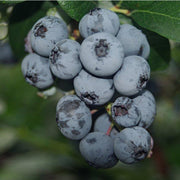 These blueberries grow in tightly packed clusters just before the end of the stem making them slightly more difficult for birds to eat. They also do not ripen at the same time extending the growing season. A standard, medium sized berry with a dusty blue skin and deep blue flesh, this berry is sweet and makes for great eating off the bush. This semi-high bush variety is self fertile but will pollinate with other blueberries planted in the area. They arrive in 1G or 3G Containers. This is the third blueberry we carry to ripen.