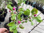 The Granny Smith apple is a late-season variety, typically harvested in late October, and can store well for several months under proper conditions. The tree is moderately vigorous and upright with lateral branching, and may require thinning to ensure good fruit quality. It is also known for its high productivity and good disease resistance- particularly to Apple Cedar Rust. Its branching tendency and spur bearing growth habit is ideal for espalier. The Granny Smith apple is a versatile fruit that can be used in a variety of culinary applications, from baking and cooking to eating raw or using in salads. Its tart flavor pairs well with sweet or savory ingredients, and it is often used in recipes for pies, tarts, and sauces.