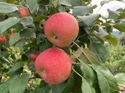 Developed in the 1990s by the Pacific Agri-Food Centre in British Columbia and is another offspring of the prodigious Golden Delicious. This apple is similar to a Jonagold but with greater firmness and storage ability. A strong mid-season apple, the Creston ripens at the height of apple season. The skin is yellowish-green that blushes to a soft red color with faint stripes. The flesh is creamy white in color, fine grained and sweet. The tree is moderately vigorous and tends to spread. Prune this tree lightly to help stave off biennialism. This is Noel's favorite apple.
