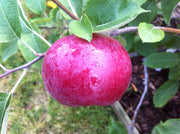It is a great all purpose apple. It is medium-sized and covered in a maroon-red blush with green and yellow undertones. Highly aromatic, crisp full flavored with a pure white flesh. It matures early, stores well and is naturally resistant to scab, fireblight, apple cedar rust, and is very winter hardy. This apple has a mellow flavor that is more subtle than sharp.