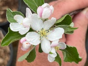 The tree is medium-sized and has a semi-dwarfing growth habit, meaning it is smaller than standard apple trees. It has a vigorous growth rate and produces a spreading canopy. The tree blooms in mid-season, producing pink to white flowers. The apple is medium to large in size, with a round to slightly oblong shape. It has a yellow-green skin with a slight blush and some russeting, which is a brownish, rough-textured skin. The flesh of the apple is crisp and juicy, with a sweet flavor and a slightly tart finish.