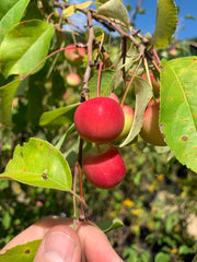 Manchurian Crabapple is a native of northern Asia. It is now grown worldwide as an ornamental and is often employed as an apple tree pollinator. It features clusters of very fragrant white flowers that cover the tree in late May. The edible fruit is red to yellow and measures about a centimeter across its mid-section. The fruit is, however, very tart and should be mixed with other fruit or could be pressed for a sharp cider.