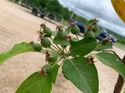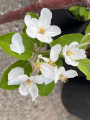 A prolific bloomer, the Mont Blanc Crabapple's bud is a bright pink in color that opens to a snow white flower after many other blooms have opened. Good pollinator for later opening trees. Disease and scab resistant it works well in tighter orchards and can handle high density planting. Fruit is large for a crabapple and are dark green in color to deep red upon maturity.