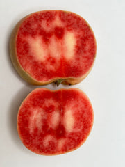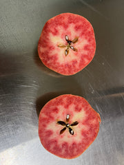 This red-fleshed apple is medium-large sized and has a yellow-orange translucent skin. The internal color varies from pink to a deep red. The pink crisp juicy flesh is tart to sweet tasting. This apple is best for fresh eating and pink apple sauce. The apple does not store well and ripens once they start to fall from the tree. Keep a watchful eye on this apple- once it starts to drop- its ripe and ready to eat. Enjoy this apple quickly or can/jar for longevity and can store for up to 4 weeks.