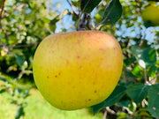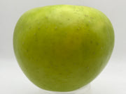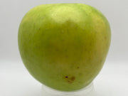 The apple, as the name suggests, is green. It is also quite large reaching to almost softball sized. The skin turn slightly yellow and even a bit of red blush toward the end of the season as the apple ripens. Its flesh is yellow, coarse-grained, firm and crisp. It is juicy, slightly sweet, and tart. Most people eat the apple off the tree or use it in pies. The flavor reaches its peak about 2 weeks in storage and the apple should be used within a couple months. Lastly, it is moderately resistant to fireblight.